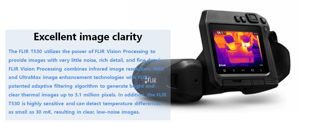Make key decisions faster Advanced imaging technology and outstanding sensitivity help you make the right decisions quickly ? With FLIR Vision Processing technology supported by powerful MSX, UltraMax? And adaptive filtering algorithm, ensure that the generated thermal image has industry-leading sharpness ? Enable the laser distance measurement function on the screen through the touch button to determine the accessibility of the parts to be repaired ? Thanks to a 4-inch scratch-resistant LCD screen that is 33% brighter and has 4 times higher resolution than comparable thermal cameras, this camera helps to easily identify problems and make quick decisions |