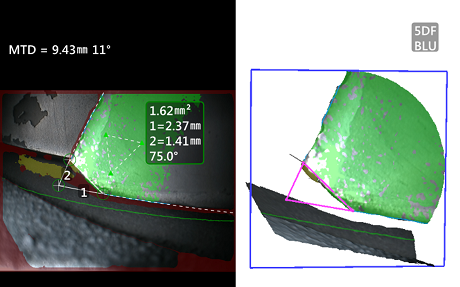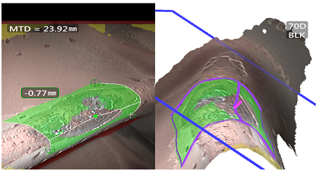 工業(yè)視頻內(nèi)窺鏡MViQ的“測量參考面”功能,可通過一-次測量 同時準確測得軸向及徑向損傷的長度,也可以實現(xiàn)對葉尖丟失面積的精準測量 |