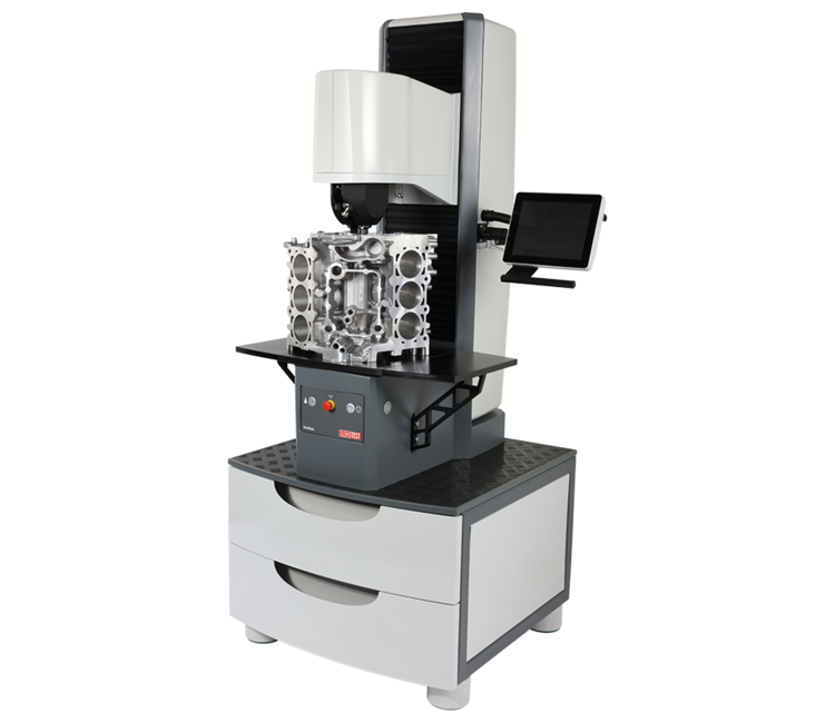 DuraScan基于獲得的V型概念進(jìn)行了緊密和不對稱的設(shè)計,采用了電動測頭和垂直方向上固定的載物臺。測頭在y-軸和z-軸方向可移動,而載物臺則在x-軸方向可移動。