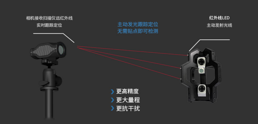 特別的跟蹤技術(shù)采用特別的LED光學(xué)跟蹤技術(shù),無須貼點,主動尋靶技術(shù)使得AutoScan系統(tǒng)在到位精度、重復(fù)精度上具有強大優(yōu)勢,大幅提升三維測量效率 |