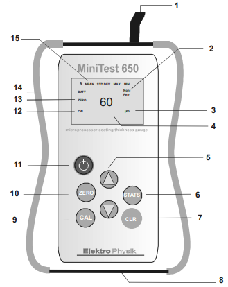 1.探針 2. Non-Ferr,表示鐵(Ferr)或非鐵(Non-Ferr)基材的測(cè)量原理。 3.測(cè)量單元。 根據(jù)讀數(shù)在μm / mm之間自動(dòng)切換。 4.個(gè)帶浮點(diǎn)的4位液晶顯示器(帶毫米) 5.箭頭鍵,用于調(diào)整要求的參數(shù)(例如校準(zhǔn)值) 6.調(diào)用統(tǒng)計(jì)信息的鍵 7.清除鍵 8.電量計(jì)背面的電池盒 9.通過標(biāo)準(zhǔn)進(jìn)行校準(zhǔn)的關(guān)鍵 10.無(wú)需校準(zhǔn)標(biāo)準(zhǔn)即可將儀表歸零的鑰匙 11.開/關(guān)鍵 12.表示使用校準(zhǔn)箔的校準(zhǔn)方法 13.表示調(diào)零 14.BATT:指示電池電量低 15.表示顯示屏上顯示的值是統(tǒng)計(jì)值 |