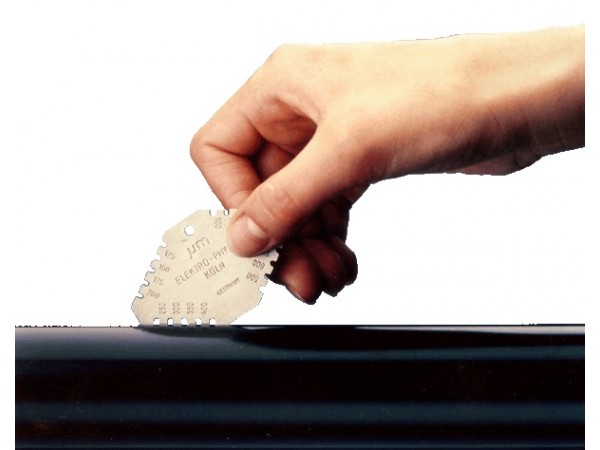 使用SurfaTest可以輕松測量濕漆涂層:涂完漆后,立即將其放在濕漆上,然后將測量梳的兩個外齒向下壓到基材上。 然后,您可以在16個測量點上讀取漆膜的厚度:濕膜厚度顯示在*后面一個浸有漆的牙齒和第一個不浸漆的牙齒之間。 使用后,您可以使用適當(dāng)?shù)娜軇┛焖偾鍧崪y量梳。