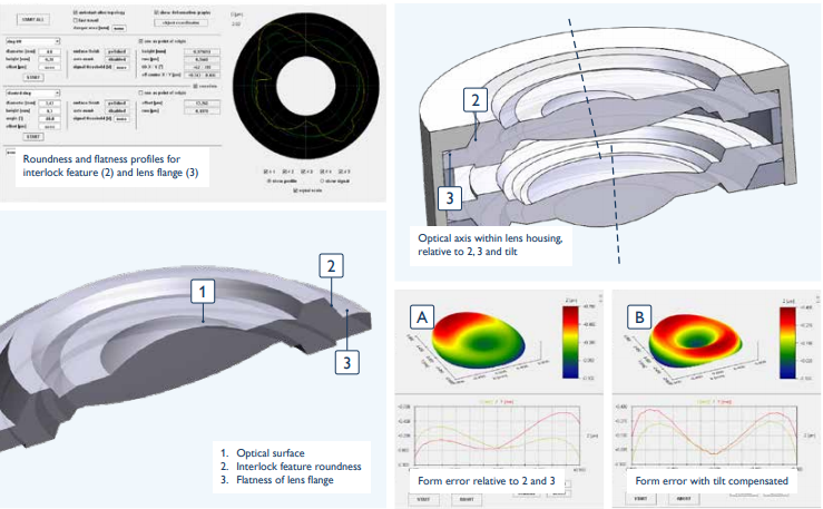 快速測量和分析光學(xué)表面和幾何特征。 測量光學(xué)表面和幾何特征,例如互鎖表面的圓度,平面透鏡表面的平坦度以及光學(xué)表面相對于這些特征的位置。 光學(xué)表面偏離中心并相對于互鎖特征位置和鏡頭法蘭傾斜。 分析結(jié)果(A)顯示了光學(xué)表面相對于聯(lián)鎖和透鏡法蘭的透鏡形狀誤差。 結(jié)果突出顯示了實際形狀誤差,如果將透鏡放入組件中并相對于這些特征對齊,則會看到該形狀誤差。 光學(xué)表面(B)顯示傾斜補償?shù)男螤钫`差 |