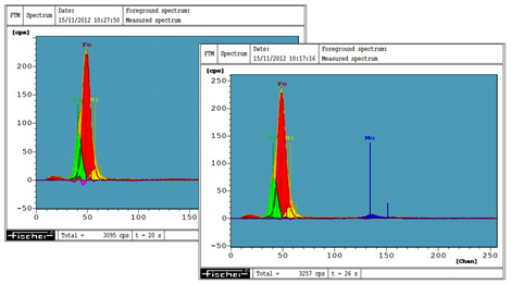 圖3:在螺栓上搜索鉬的X射線測量的WinFTM®圖。 左圖為“普通”不銹鋼螺栓,右圖為含鉬的螺栓,使用壽命更長。