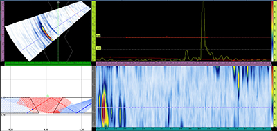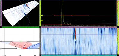 如果焊冠的形狀足夠規(guī)整而可以在無過多衍射的情況下反射聲束,則可以探測到遠(yuǎn)端側(cè)壁融合的缺陷。本檢測實(shí)例就是這種情況。由于焊冠高度而使聲波傳播了更多的行程,會使視圖中的缺陷沒有正好出現(xiàn)在焊縫坡口上,而是出現(xiàn)在稍微遠(yuǎn)離坡口的位置,但是圖中可以非常清晰地觀察到這個(gè)缺陷指示。