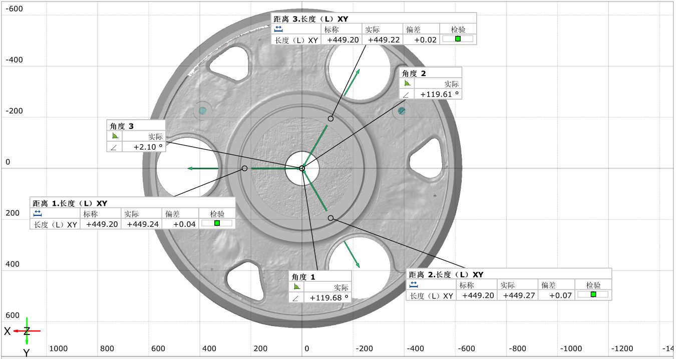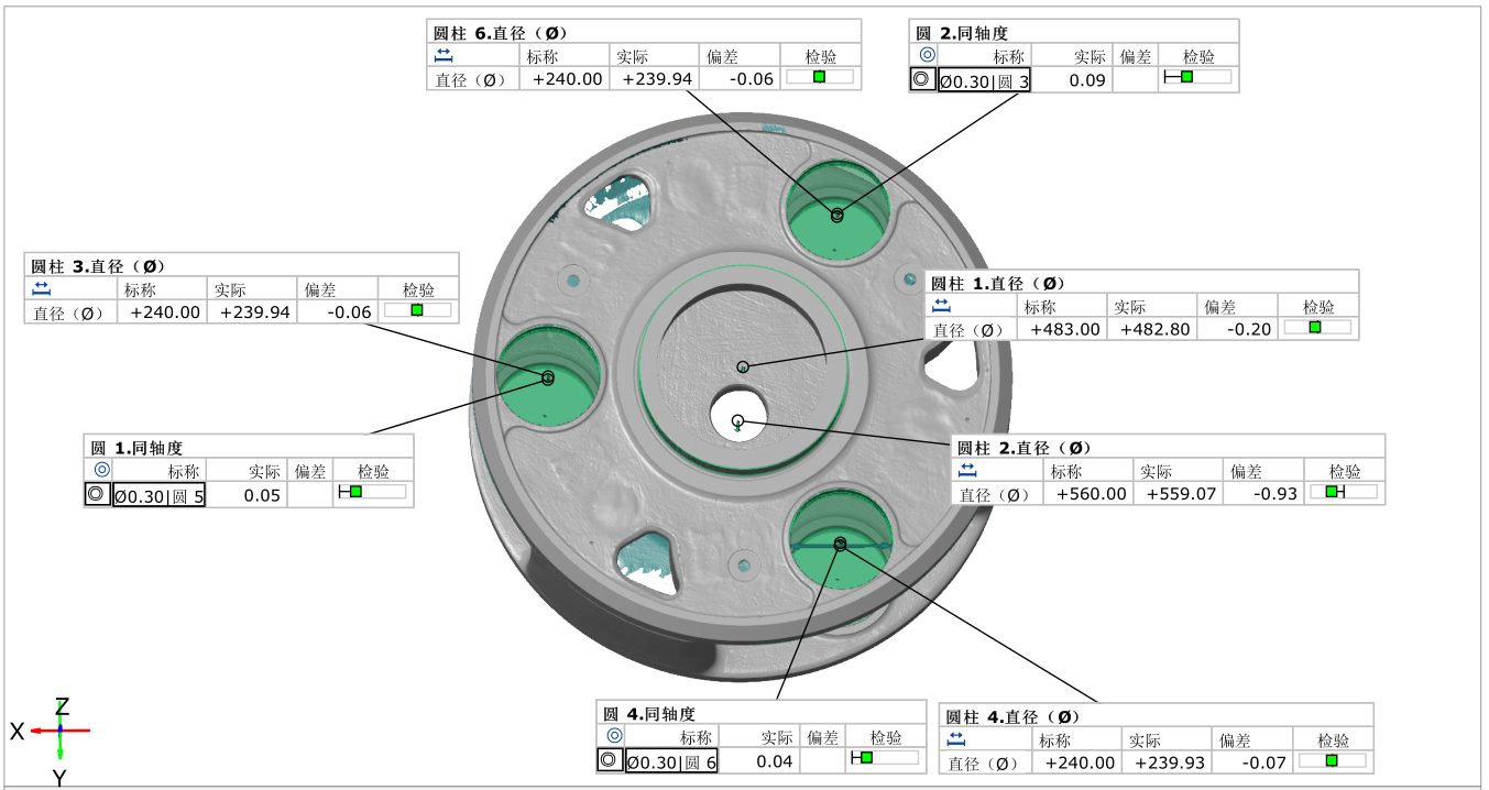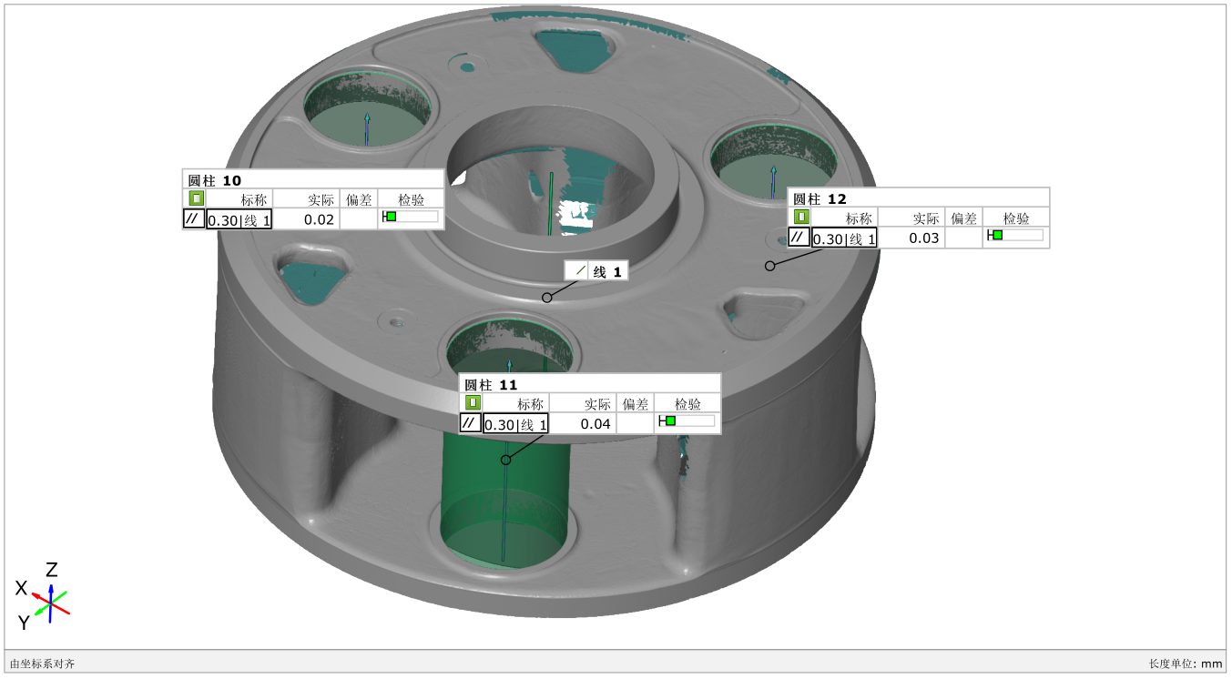KSCAN-Magic內(nèi)置全局?jǐn)z影,智能邊界探測,適用于大型工件的高精度掃描。KSCAN-Magic對環(huán)境的溫度和濕度沒有特殊要求,在現(xiàn)場即可開展測量,其小巧便攜的外形也擺脫了運(yùn)輸行星架的麻煩。Magic的超大拍攝面幅和景深,在測量長達(dá)1m的風(fēng)電行星架時擁有出色表現(xiàn),體積精度高達(dá)0.02mm/m。MAGIC單束藍(lán)色激光線掃描,精準(zhǔn)快速獲取內(nèi)部深腔部位的三維數(shù)據(jù)??蛻舾鶕?jù)需求進(jìn)行反向測量,測量了行星架的孔位直徑、距離、位置度、同軸度、軸心線的平行度,掃描結(jié)果如下所示: