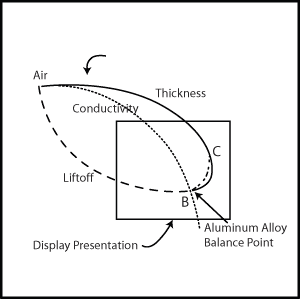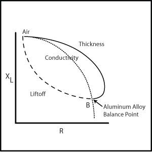 圖1顯示的是一個(gè)典型的阻抗平面圖,圖中的坐標(biāo)軸分別為電感抗(XL)和電阻(R)。當(dāng)探頭處于空中時(shí),點(diǎn)位于電導(dǎo)率曲線的頂部,隨著材料電導(dǎo)率的增加,這個(gè)點(diǎn)會(huì)沿著曲線向下移動(dòng),點(diǎn)B的位置為待測(cè)鋁合金的平衡點(diǎn)。 從點(diǎn)B位置開(kāi)始,隨著材料厚度的縮減,點(diǎn)會(huì)沿著厚度曲線向上移動(dòng)。 |